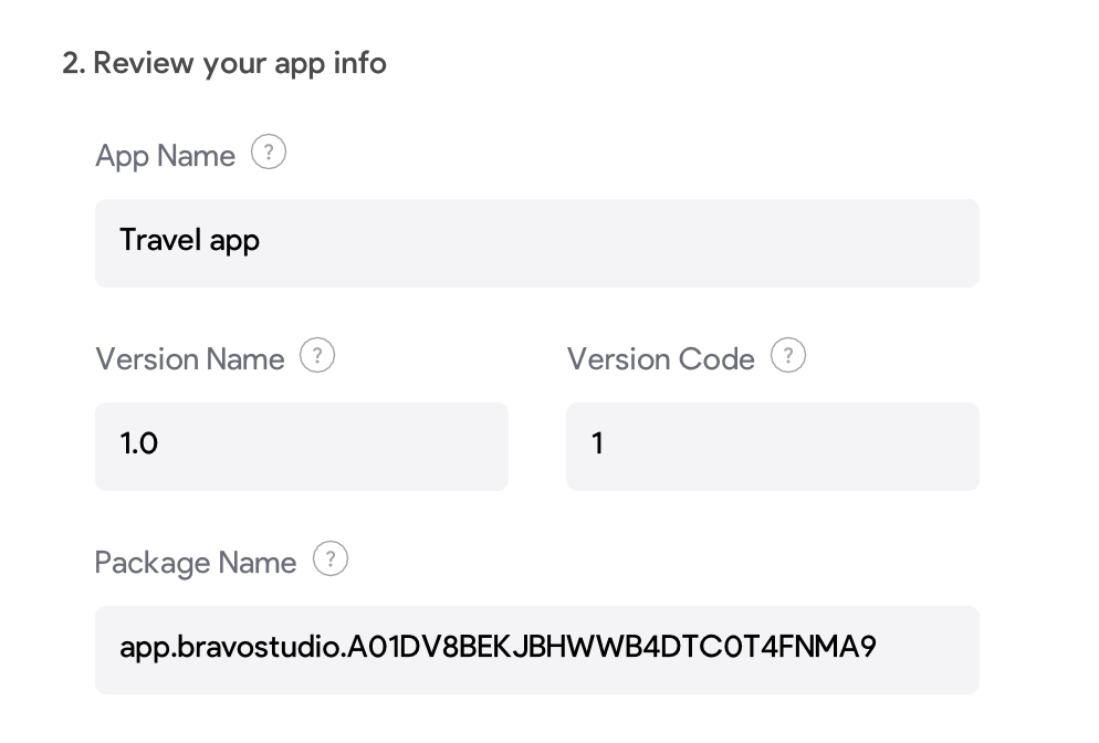 4. For step 2, change the App Name if you'd like. We recommend keeping the default Version Name, Version Code, and Package Name unless you know how to configure them.