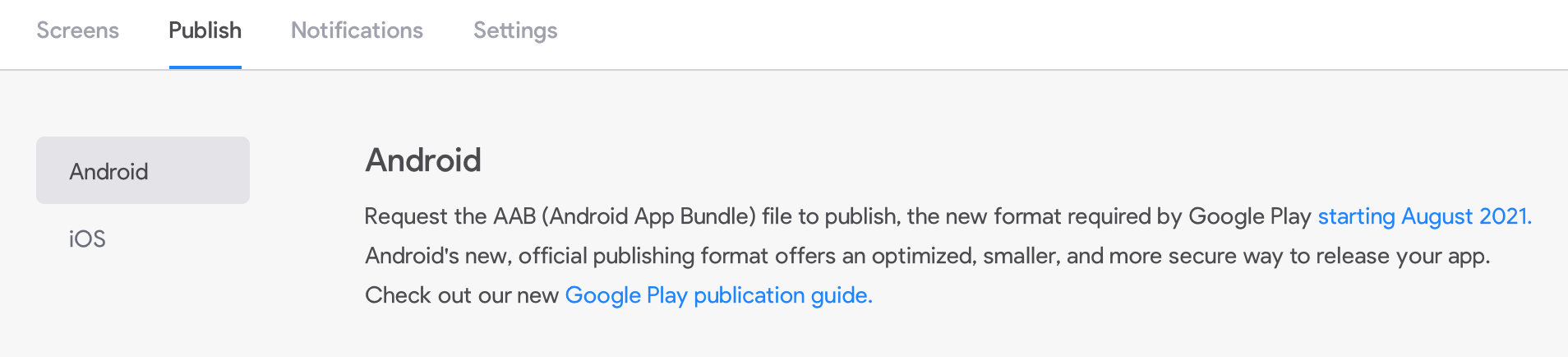 Click Get Publishable AAB to request the app package. Once the package is generated (it usually takes less than 1 hour), you will be able to download it from the History tab, up to 30 days after generating it. You will also receive a confirmation email, together with a download link.