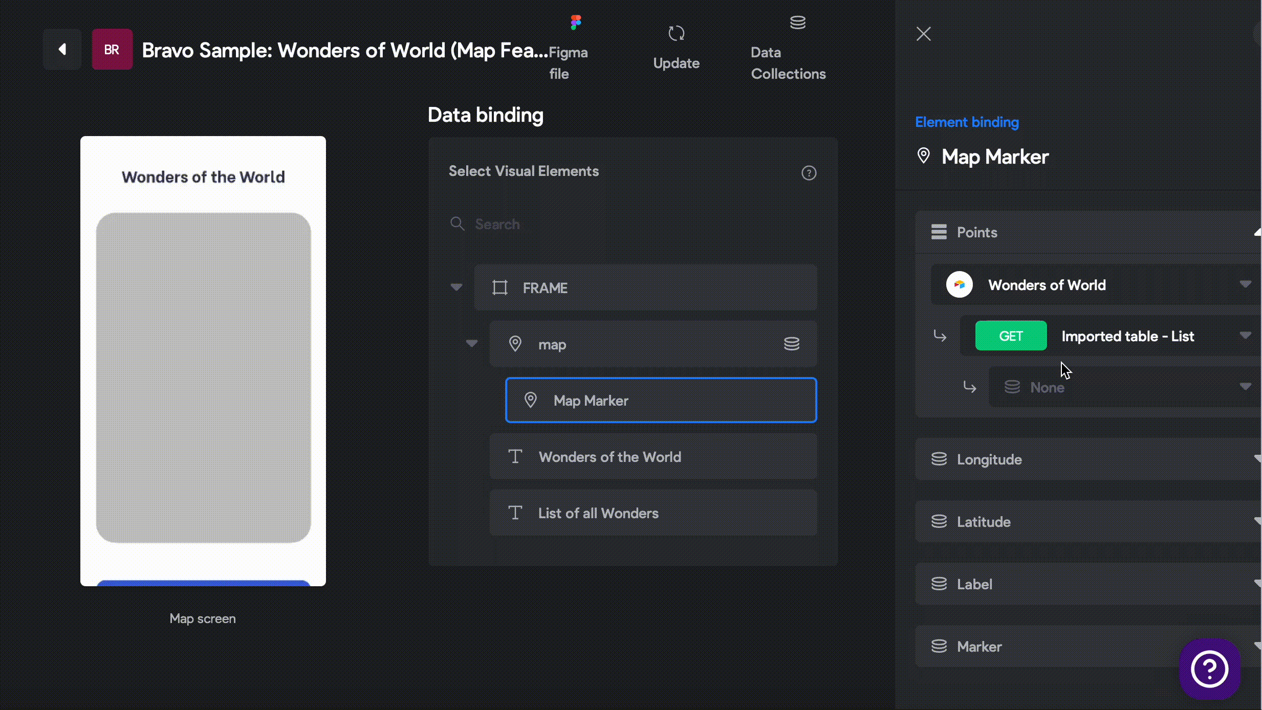 Once the design file is ready, import it into Bravo to bind it to the list of markers. The map component will be displayed in the Data Binding section, with some bindable properties.
