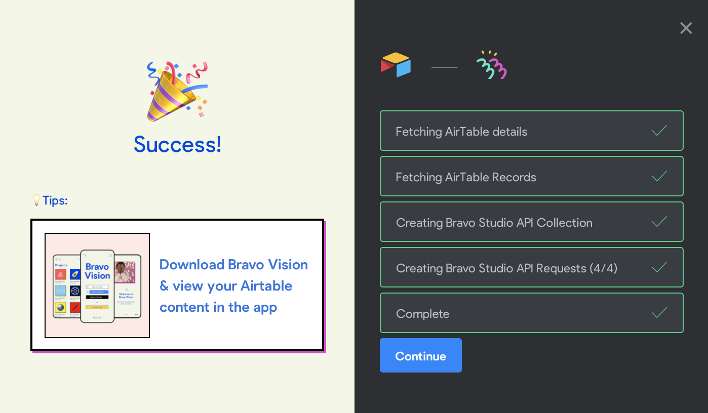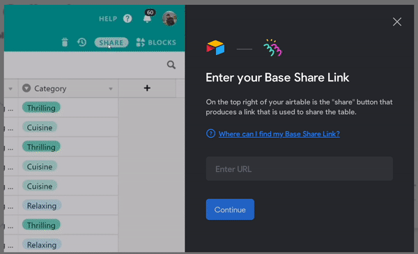 2. Follow the onscreen instructions to find the share link of your Airtable base. Click Continue.