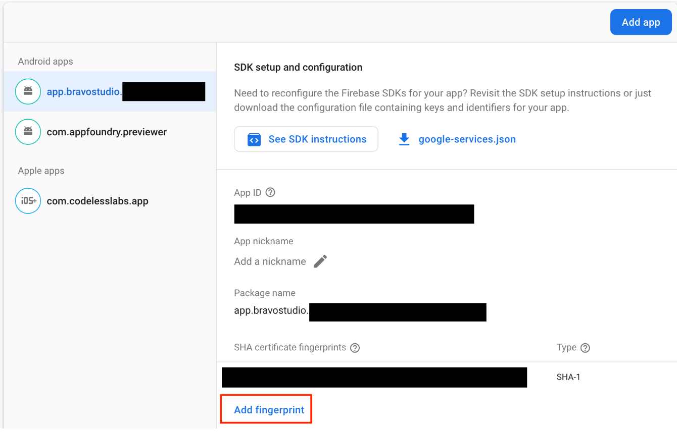 Now, you need to obtain the Firebase configuration files (GoogleService-Info.plist for iOS and google-services.json for Android) and upload them to Bravo. The purpose of this configuration file is to create a link between our app and this Firebase project. So, if in the future, you want to connect to another Firebase project, you can do it by uploading a new Firebase configuration file in Bravo for each mobile platform (iOS and Android). Depending on your needs, you can either: - Set up your Firebase Login for Bravo Vision (recommended for prototyping and testing) - Set up your Firebase Login for your live or published app (recommended for publishers)