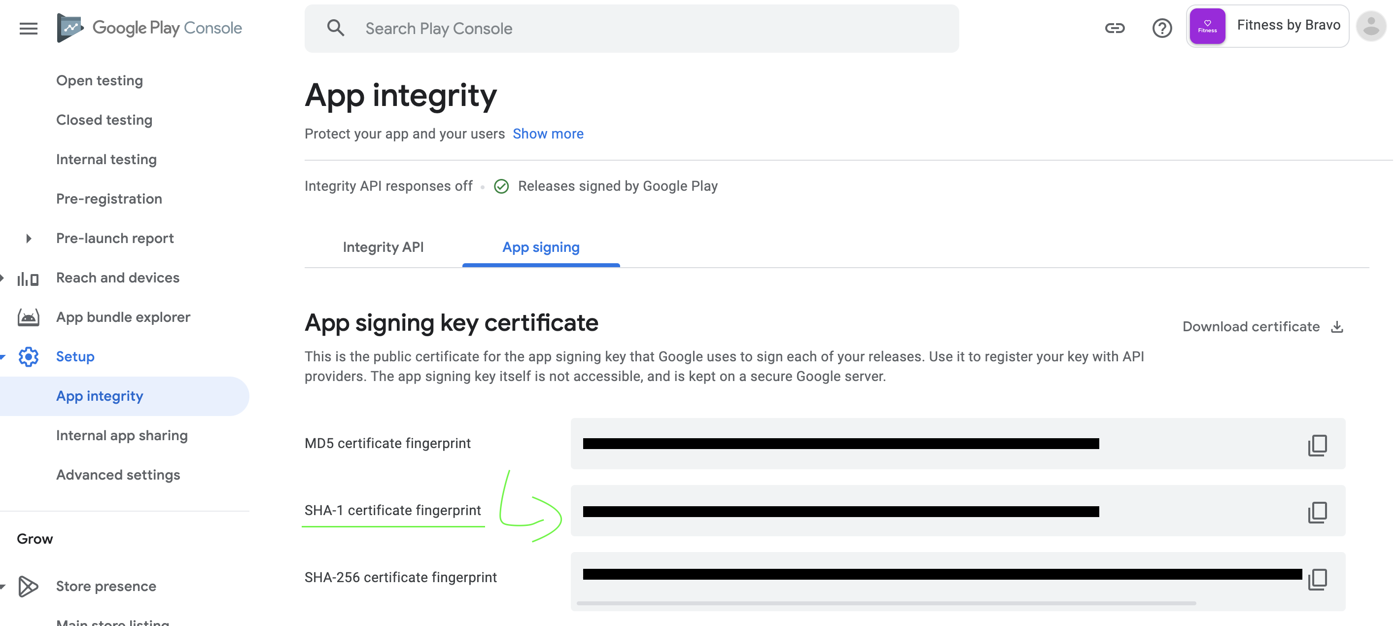 Google Play SHA-1 certificate fingerprint Once copied, go to Firebase and to the corresponding Firebase app inside your project, under SHA certificate fingerprints, click "Add fingerprint" and paste both SHA-1 codes. Make sure that you've added two SHA-1 codes.
